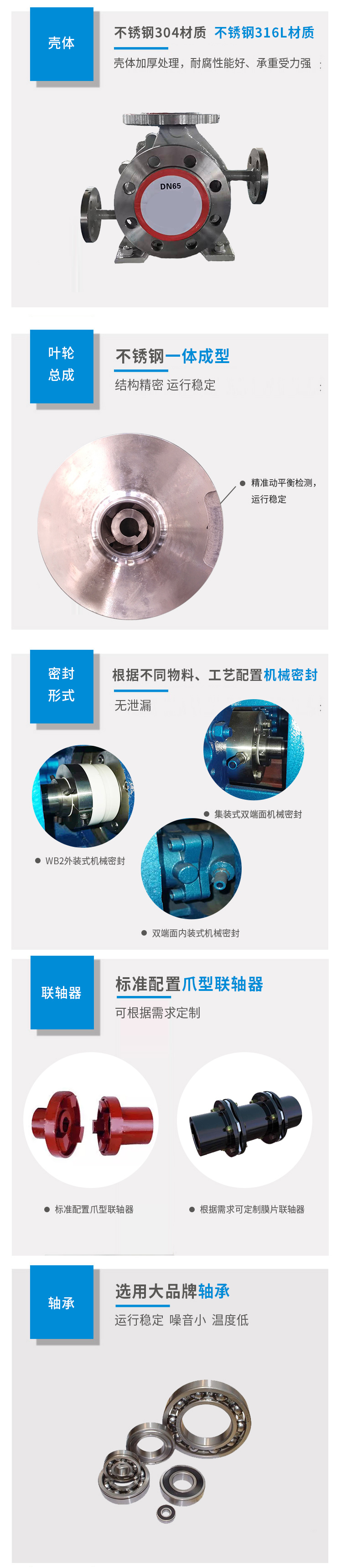 該系類泵根據不用的介質工況采用多種密封方式:外裝式波紋管機械密封,單端面內裝機械密封,雙端面內裝機械密封,集裝式雙端面機械密封,內裝高溫高壓波紋管機械密封。機械密封材質根據介質的不同選用不同的材質。耐腐耐磨、密封性能好、安裝簡便、易維護。