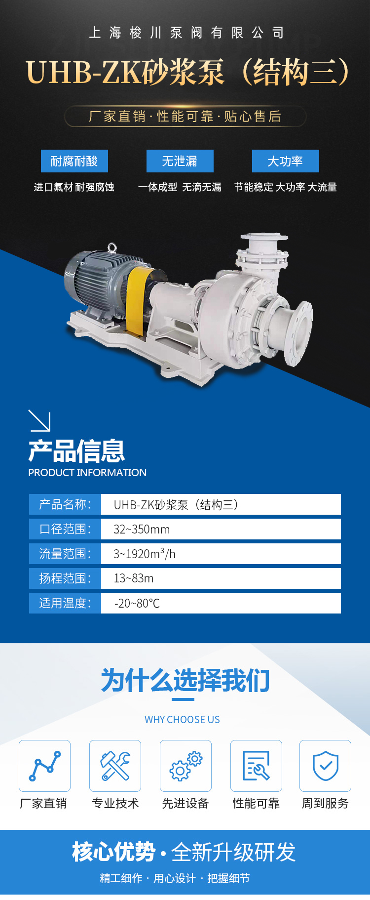 用途 本產品廣泛適用于:酸、堿、鹽、油類、食品飲料、酒類、有機溶劑等液體,尤其適用于輸送含細穎粒狀的強腐蝕性液體。 適用溫度:-20℃~80℃ 設計特點 耐離耐磨 UHB-zK型系列砂漿泵為懸臂式單級、單吸離心泵,其過流部件采用鋼襯超高分子量聚乙烯制造,具有較強的耐腐蝕性、卓越的耐磨性、抗蠕變性(耐環境應力開裂),同時采用金屬基體結構,提高了產品的承壓能力。 多功能 一種泵能適應各種不同的工況。如:既可以輸送酸、堿類清液或料漿,也可以輸送冶煉行業各種腐蝕性礦漿,還可以輸送硫酸行業各類稀酸、環保行業的各類污水等。 多種密封 該系列泵采用多種密封方式:K型動力密封、單端面機械密封、集裝式機封和雙端面機械密封,可根據具體工況條件選用。