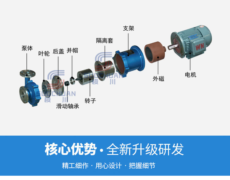 CQ型不銹鋼磁力泵系列產品具有設計合理、全密封、無泄漏、耐腐蝕等特點。在外觀方面不銹鋼磁力泵是遙遙領先的,外觀美觀是它的一大特點,而且結構緊湊,體積小,使用維修方便。在化工、制藥、石油、電鍍、食品、電影照片打印、科研機構、國防工業等單位廣泛應用于酸、堿液、稀有貴重液、毒液、揮發性液體、循環水設備配套、過濾機配套。特別是泄漏、易燃、易爆液體的萃取,更優選選擇該泵。