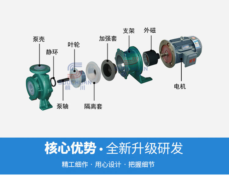 用途 本產品廣泛適用于:石油化工、制酸制堿有色金屬冾煉、汽車制造的酸洗工藝、稀土分離、農藥、染料、醫藥、造紙、電鍍、無線電等行業。適用溫度:-20℃C~100℃。 設計特點 防漏設計取消了軸封,利用磁力耦合間接驅動,完全消除了滴漏的煩惱,絕不污染場地。由于泵的過流部分選用“氟塑料合金”制造。可連續輸送任意濃度的酸、堿、強氧化劑等腐蝕介質而毫不受損。 工作原理 驅動裝置采用主動磁性聯軸器直接裝在電機軸上,泵腔完全封閉,通過磁力耦合間接驅動泵軸上帶磁鋼的葉輪旋轉,結構緊湊、安全節能。 堅固耐用的泵體 結構雖然接觸液體部分是氟塑料,但泵體基體是金屬材料,故泵體可以承受部分管道的重量及機械性沖擊,堅固耐用。