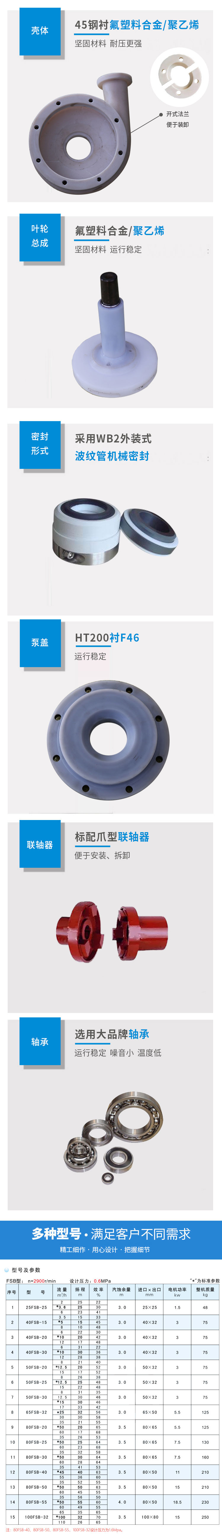 用途 本產品廣泛適用于:汽車制造中的酸洗、噴漆工藝:有色金屬治煉中的電解液輸送:離子膜燒堿項目中的氯水、廢水處理和加酸等工藝流程。使用溫度:-20℃~100℃。 設計特點 FSB和FSB(D)型離心泵,過流部件全部采用氟塑料合金制造,結構緊湊、操作簡單、價格低廉。兩種型號的泵殼、葉輪、機封等均可互換使用,深受農藥、電子、造紙等行業的歡迎。