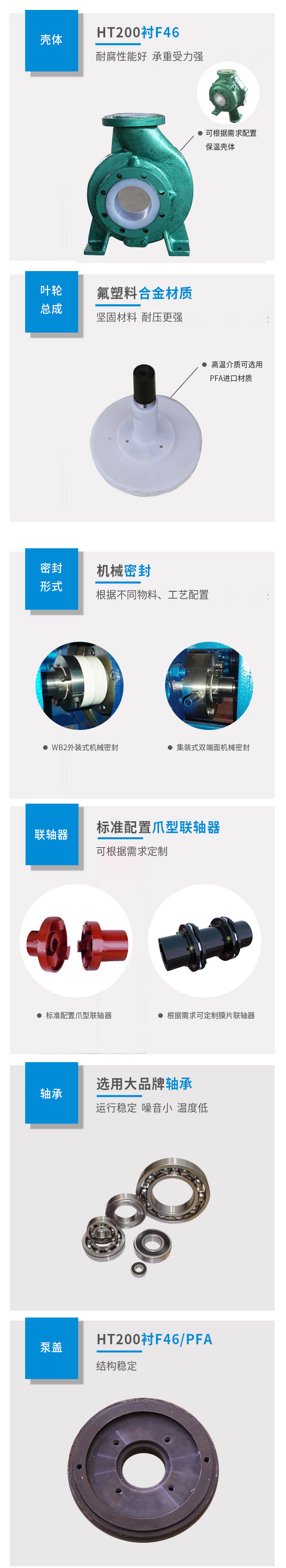 泵體和泵蓋均采用金屬(HT200)基體內襯氟塑料,葉輪采用金屬嵌件(WCB)外包氟塑料合金壓制成型。優點:耐腐蝕性范圍廣,強度高,經久耐用。