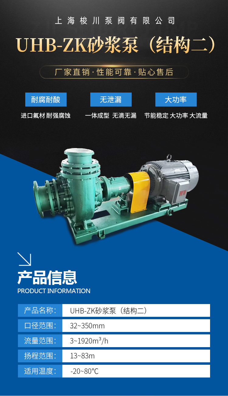 用途 本產品廣泛適用于:酸、堿、鹽、油類、食品飲料、酒類、有機溶劑等液體,尤其適用于輸送含細穎粒狀的強腐蝕性液體。 適用溫度:-20℃~80℃ 設計特點 耐離耐磨 UHB-zK型系列砂漿泵為懸臂式單級、單吸離心泵,其過流部件采用鋼襯超高分子量聚乙烯制造,具有較強的耐腐蝕性、卓越的耐磨性、抗蠕變性(耐環境應力開裂),同時采用金屬基體結構,提高了產品的承壓能力。 多功能 一種泵能適應各種不同的工況。如:既可以輸送酸、堿類清液或料漿,也可以輸送冶煉行業各種腐蝕性礦漿,還可以輸送硫酸行業各類稀酸、環保行業的各類污水等。 多種密封 該系列泵采用多種密封方式:K型動力密封、單端面機械密封、集裝式機封和雙端面機械密封,可根據具體工況條件選用。